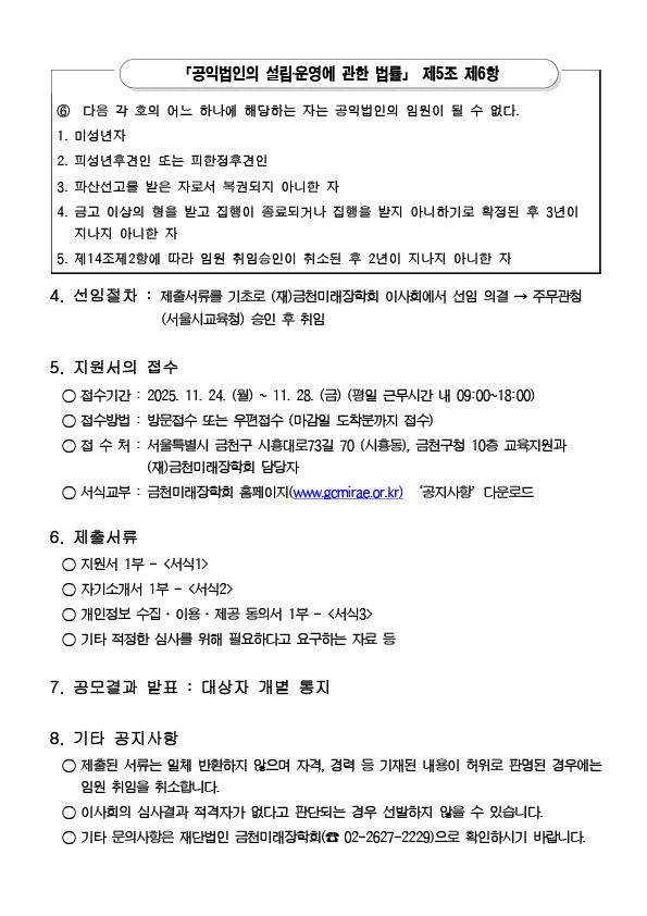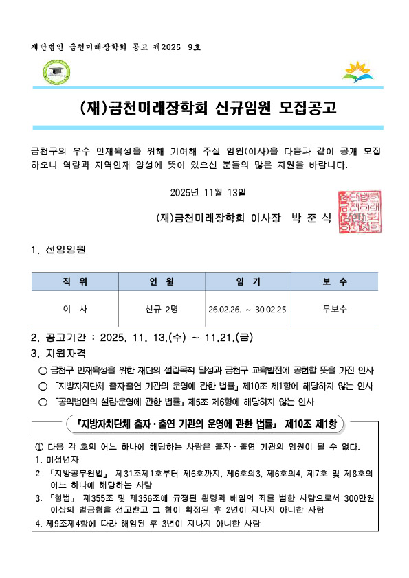 (재)금천미래장학회 신규임원 모집공고