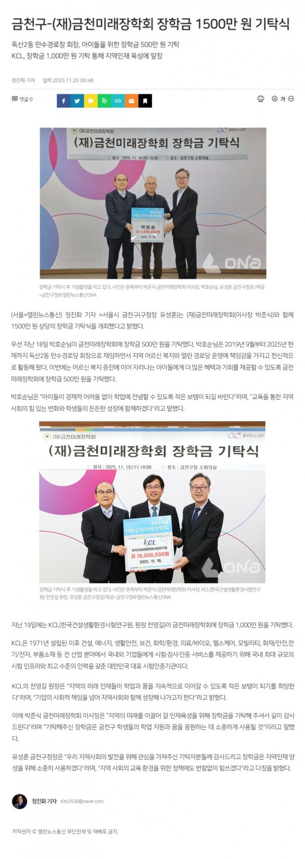 금천구-(재)금천미래장학회 장학금 1,500만 원 기탁식