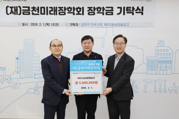 갤러리 카테고리 장학금 기탁식 2024.02.01. MG다원 새마을금고 기탁식 등록일 2024-02-05 최고관리자 MG다원 새마을금고 기탁식 이전글 2024.05.15. 대한불교조계종 호압사 장학금 기탁식 다음글 2024.02.01. 금천구 건축사회 기탁식 목록으로
